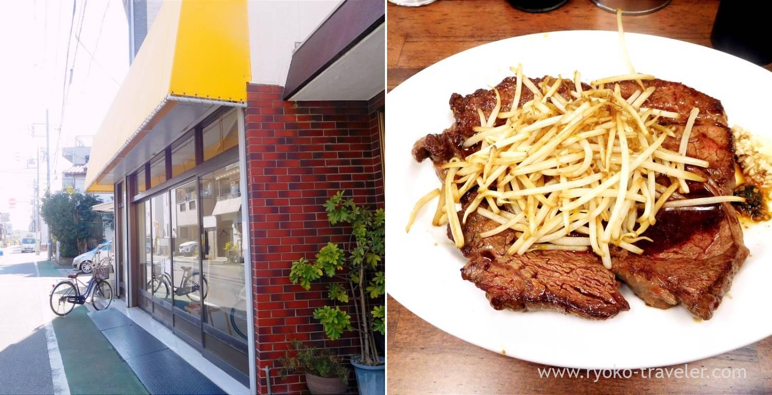 The steak is 1 pond. 450 g. So, I thought I can’t eat up both rice and steak. So, I bought a ticket of Steak only. With rice and without rice is same price. 1600 yen. Everyone ordered rice and steak except me. So, I felt uncomfortable a bit. But it couldn’t be helped. I didn’t want to leave foods.