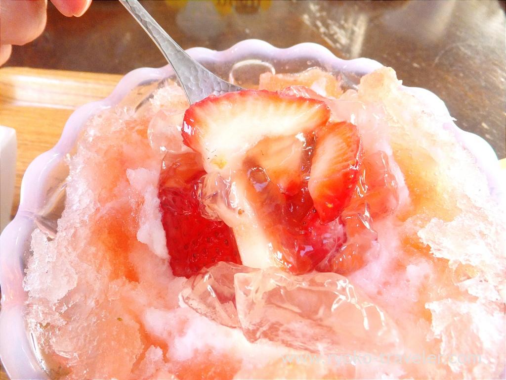 Everyone ordered this. W strawberry. It had plenty of strawberry syrup. It’s fresh syrup. It’s sour a bit. And condense milk was served separately. So, sweetness and sourness was mixed. Good. By the way, you might think what is “W” ? You’ll realize everything if you see inside of the kakigori.