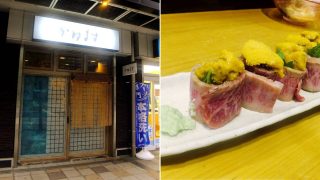 Discover Kanemasu (かねます), a unique stand-up izakaya near Kachidoki Station, offering high-quality dishes like raw sea urchin wrapped in beef and fresh seafood from Tsukiji. Perfect for a memorable dining experience!