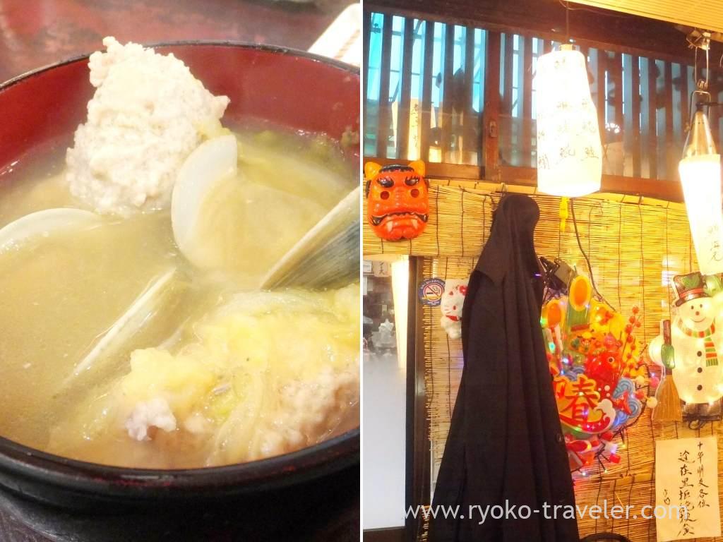 And then, this hot soup was served. Hard clam and chicken ball soup. You might not feel it looks tasty from its simple looking, but the soup had abundant extract of chicken and clams by simmered for a long time ! It’s the taste of happiness in cold winter.