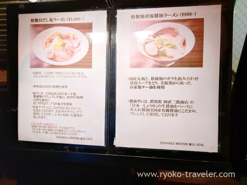I felt like eating sio ramen on my way back to home from Nippon Budokan, so I had ramen at noodle meister GENK (源九) close to Kudanshita station. Also I wanted to avoid the crush around Kudanshita station :p They are located close to the station, but they are at the back of the main street. So, there wasn’t many people in the shop. They have counter seats mainly and they have only one table.