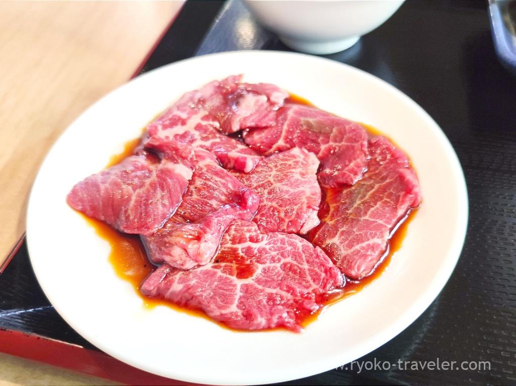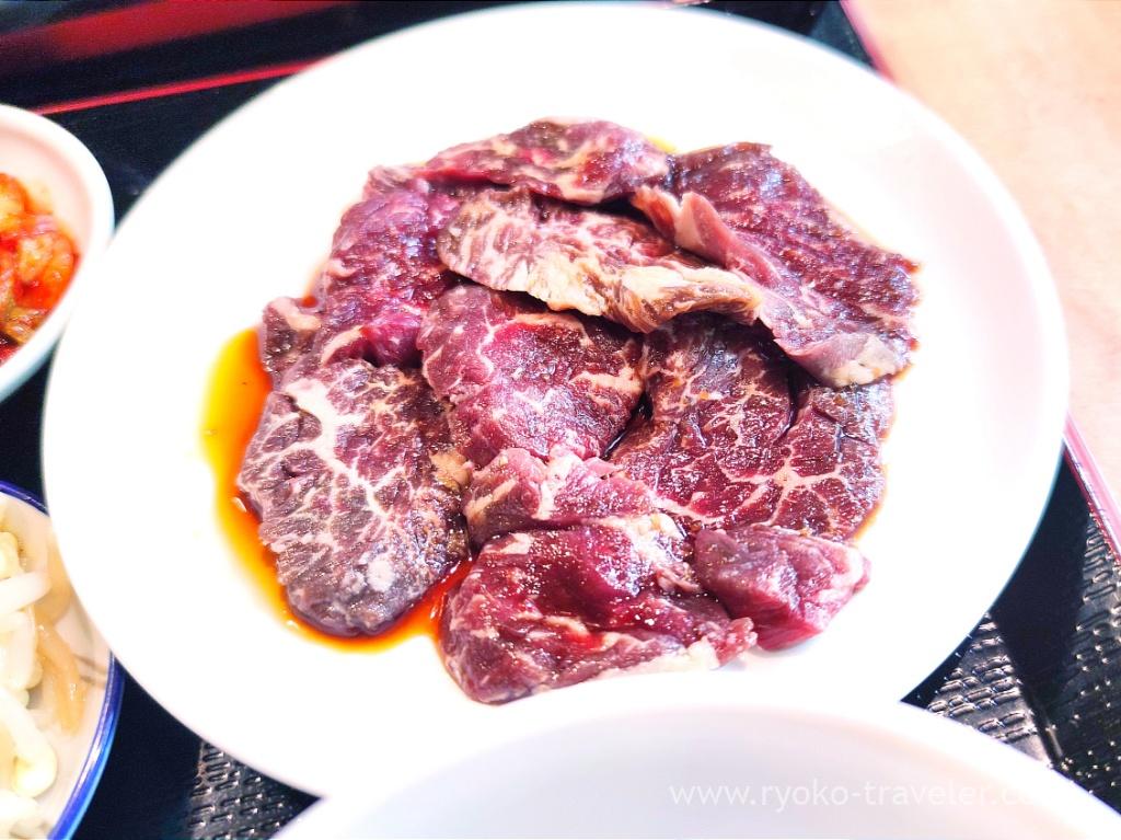 The staff said the amount of it is as same as one that is served as leftover fresh Japanese beef meat set. It was cut thinner, but delicious. Soft. I was surprised at that it cost only 500 yen with rice and so on. And if you order glass beer, it cost within 1000 yen. Wow..
