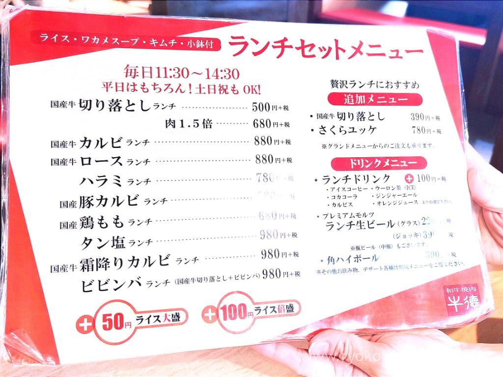 Menu. They offer valuable lunch on everyday. And we can also order from regular menu on Saturdays, Sundays and another national holidays. Lunch menu. The most inexpensive set is leftover fresh Japanese beef meat (= kiriotoshi). Only 500 yen (with tax).