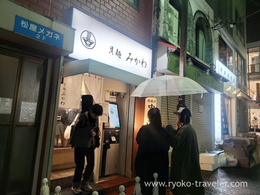 After finishing my errands in Shimokitazawa, I felt like having some ramen and started looking around. That’s when I found a place that looked promising, so I decided to check it out. The shop is called Kaimen Mikawa (貝麺みかわ). I don’t know this neighborhood very well, but it seems to be a very popular spot. Even though it was raining in the evening, there were about five people waiting in line. The photo was taken around the time I was leaving, when I thought it must be close to last order, but there were still people waiting.