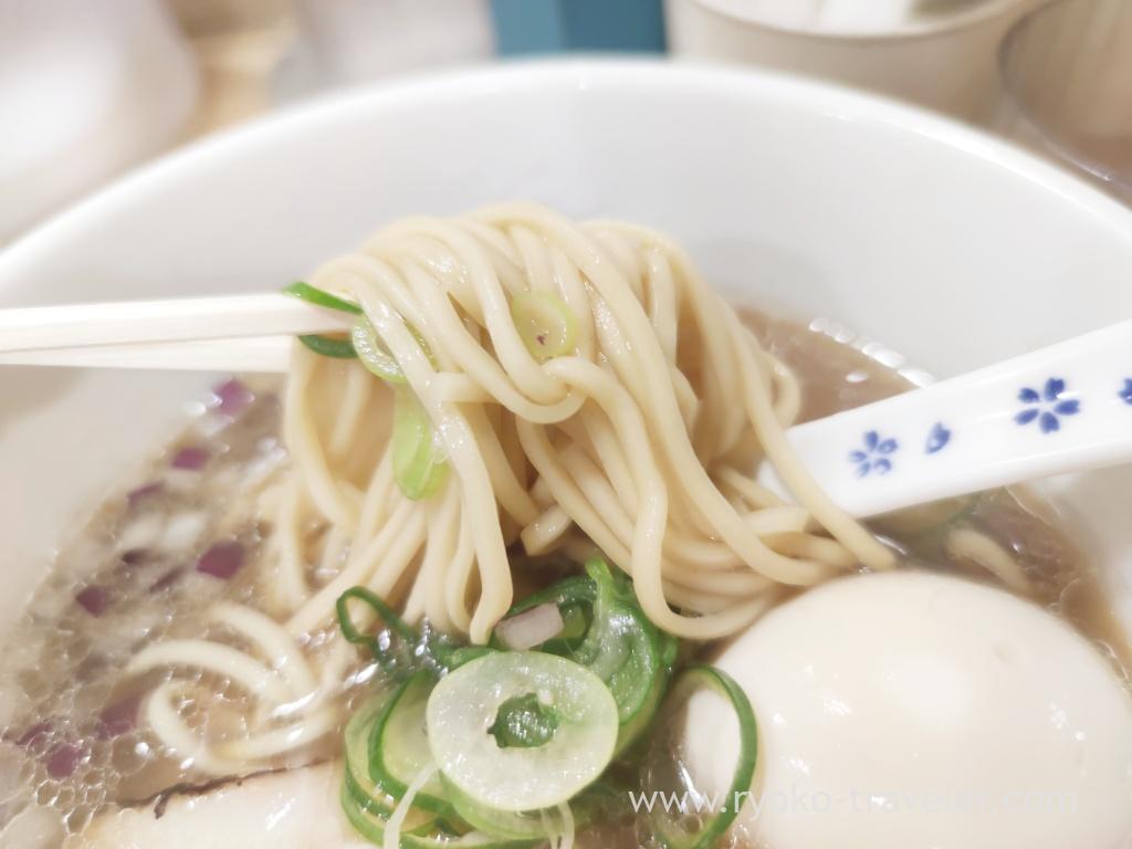 It’s a very beautiful bowl of ramen. The toppings include two kinds of chashu pork, green onions, red onion, and the seasoned egg. Even in the soy sauce soup, I could fully taste the shellfish extract. Perhaps to let the shellfish shine, the soy sauce flavor is kept fairly mild. The soup is rich, mellow, and delicious. It seems that the soy sauce ramen also contains beef extract. The egg yolk was perfectly soft and runny.