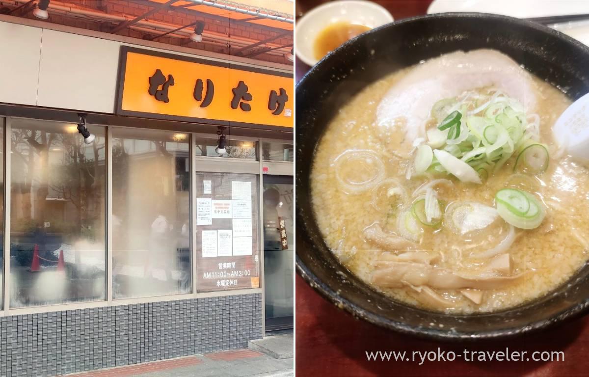 Naritake is open until 3 a.m. basically and people enjoy ramen there after drinking alcoholic drinks somewhere in mid-night. (Now they close earlier because of covid-19). There’re 6 branches in Japan, and Paris have a branch, too. By the way, Paris branch is called “Paritake” by Naritake lovers :p