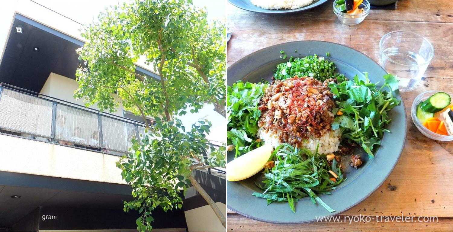 Their most popular curry is it. Ethnic soboro curry. All curry can be chosen the level of the spiciness. I ordered the most spicy one. “Soboro” means minced meat. Rice covered with nuts, curry flavored-minced meat, coriander, green onion, perilla (shiso), and thinly cut red pepper. It’s not an appearance of curry. Much grasses ! And all curries have pickles.