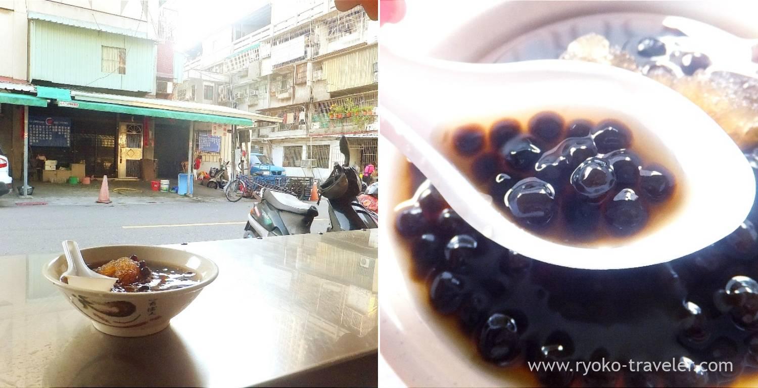 As their name, they sell shaved ice mainly. “QQ” means “springy texture” and “粉圓” means tapioca. Yes. their specialty is springy tapioca. But they don’t have English menus and they speak only Chinese. Of course, I don’t understand Chinese language and I examined their menu in advance. So inexpensive ! We can have shaved ice with only 10 TWD. Their most popular shaved ice is “黒糖粉圓冰”. 10 TWD for “For here”. They also sell soy milk pudding.