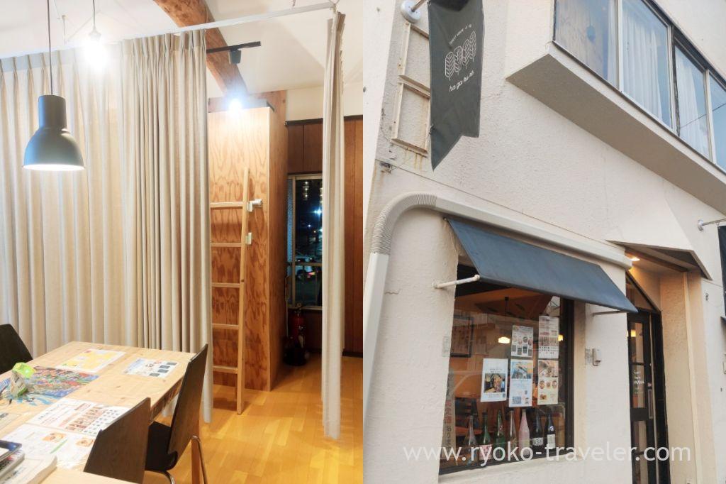 But when I tried to book a room at the last minute, there were almost no hotels available…. Maybe there just aren’t many hotels in the area. The few remaining business hotels were priced around 15000 yen, which felt a bit expensive. Just when I was hesitant, I found a guesthouse about a 5-minute walk from the station. It was the Saga International Guesthouse HAGAKURE (佐賀インターナショナルゲストハウスHAGAKURE). The first floor is a restaurant, and the rooms are rented out on the second floor. By the way, the guesthouse entrance is not here but at the back.